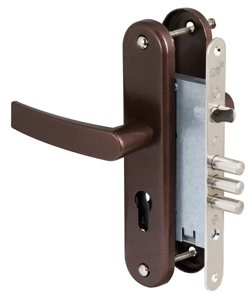 Замок врезной цилиндровый ЗВ4-31/55 с защелкой и фалевыми ручками предназначен для входных и внутренних дверей толщиной 40-50 мм жилых домов, квартир, торговых и конторских помещений. Замок универсальный, его можно устанавливать как в правые, так и в левые двери, переустановив защелку. Возможно использование замка с цилиндровым механизмом длиной 70 мм для установки в металлические двери. Межосевое расстояние 55 мм. Дверь может быть закрыта на защелку и открыта с помощью фалевой ручки при открытом засове замка. В комплекте: накладки с фалевыми ручками, покрытие «медный антик». Изготавливается с засовом из трех стальных стержней круглого сечения. Покрытие корпуса — цинковое. Покрытие лицевой и ответной планок — никелевое. Стальная защелка. Вылет ригелей — 22 мм, диаметр ригеля — 10,7 мм. Бэксет - 52,8 мм.